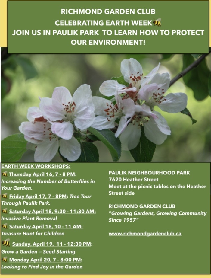 Join us in Paulik Park to learn all about taking care of the environment and attracting pollinators to your garden. Celebrating Earth Week with 7 workshops, join us in the Park at the picnic tables on the Heather Street side.